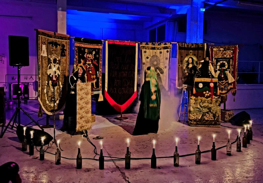 Lors d’une résidence dans la forêt qui abrite son fantastique village d’art préludien, au sein de l’église des pauvres, sur une épaisse couche de sable, amenée là par un roi fou, iels ont joué, chanté, mangé, rit, dansé, écrit cousu, bu, dormi et composé une cérémonie fondamentale.